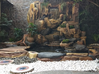 Menikmati suasana santai sambil melihat ikan dan mendengarkan gemericiknya suara tumpahan air terjun dari Dekorasi Tebing rasanya sperti berada di alam pegunungan yang asri.